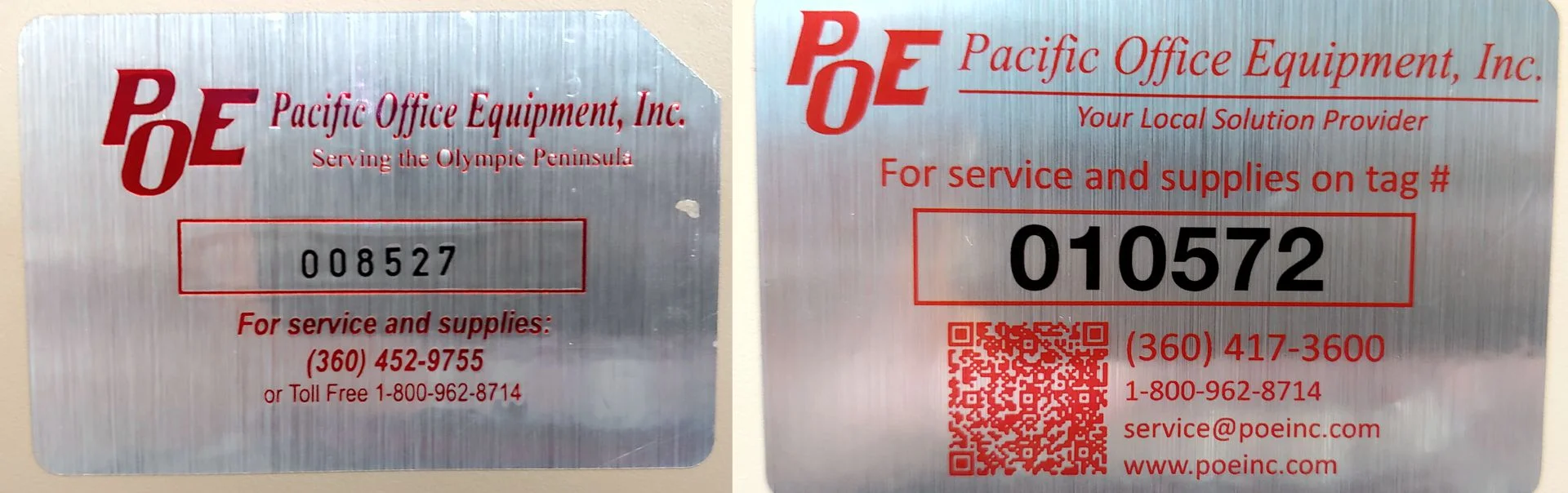 POE identifies our copier by our own tag number. To get the POE Tag Number, look for POE’s service sticker, a silver rectangle on the face of the copier.